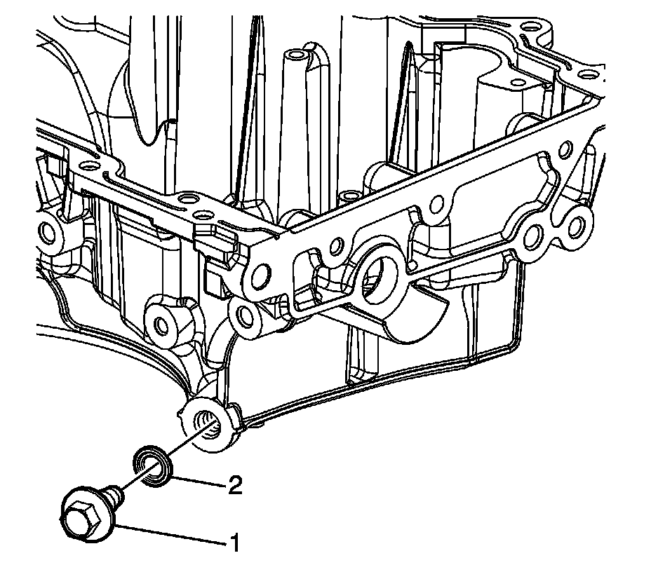 1. Install the oil pan drain plug (1) and NEW O-ring seal (2) and tighten to 25 Nm (18 lb ft).