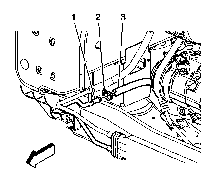8. Remove the A/C compressor hose assembly (2) from the compressor. Cap or plug the hoses and compressor to prevent contamination. Refer to Air Conditioning Compressor Hose Replacement Air Conditioning Compressor Hose Replacement.