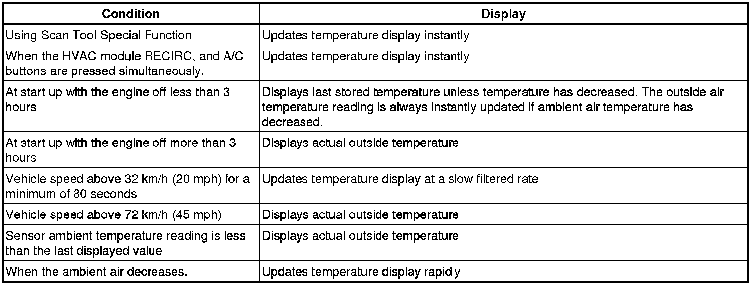 The ambient air temperature sensor mounts underhood and can be affected by city traffic, by idling, and by restarting a hot engine. Therefore, the HVAC control module filters the value of the ambient air temperature sensor for temperature display. If the ambient air temperature sensor drops below 2°C (35°F) the compressor clutch will be disabled until the ignition is OFF for more than 3 hours or an instant OAT update is performed no matter what the actual temperature is due to the filtered value being used by the HVAC control module. The ambient air temperature value is updated under the following conditions: