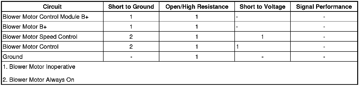 The blower motor control module is an interface between the HVAC control module and the blower motor. The blower motor speed control, battery positive and ground circuits enable the control module to operate. The HVAC control module provides a pulse width modulation (PWM) signal to the blower motor speed control module in order to command the blower motor speed. The module supplies 12 volts to the blower motor through the blower motor voltage supply circuit.