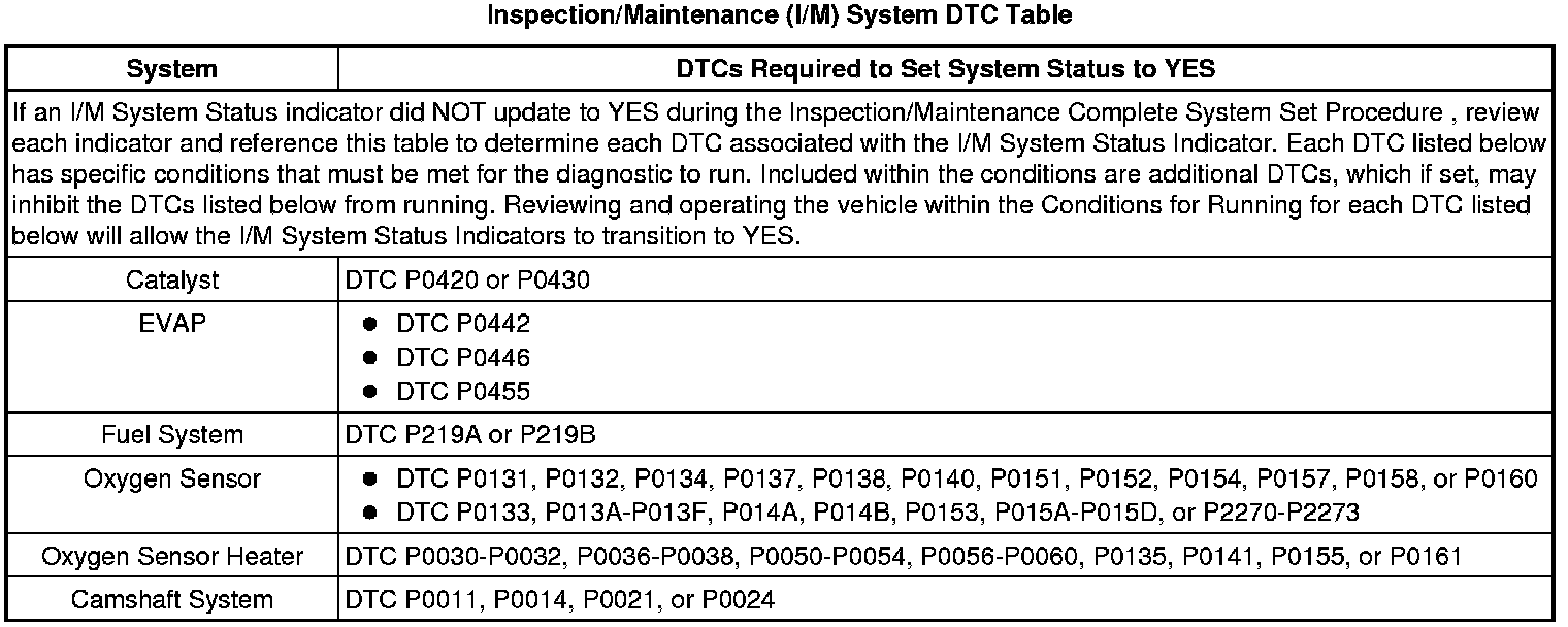 Inspection/Maintenance (I/M) System DTC Table