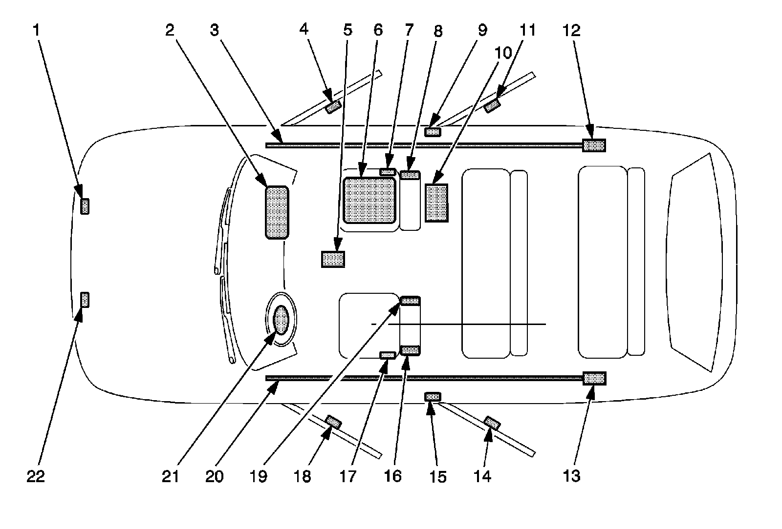 20 - Left Roof Rail Air Bag -Located under the headliner, extending from the driver front windshield pillar to the driver rear windshield pillar