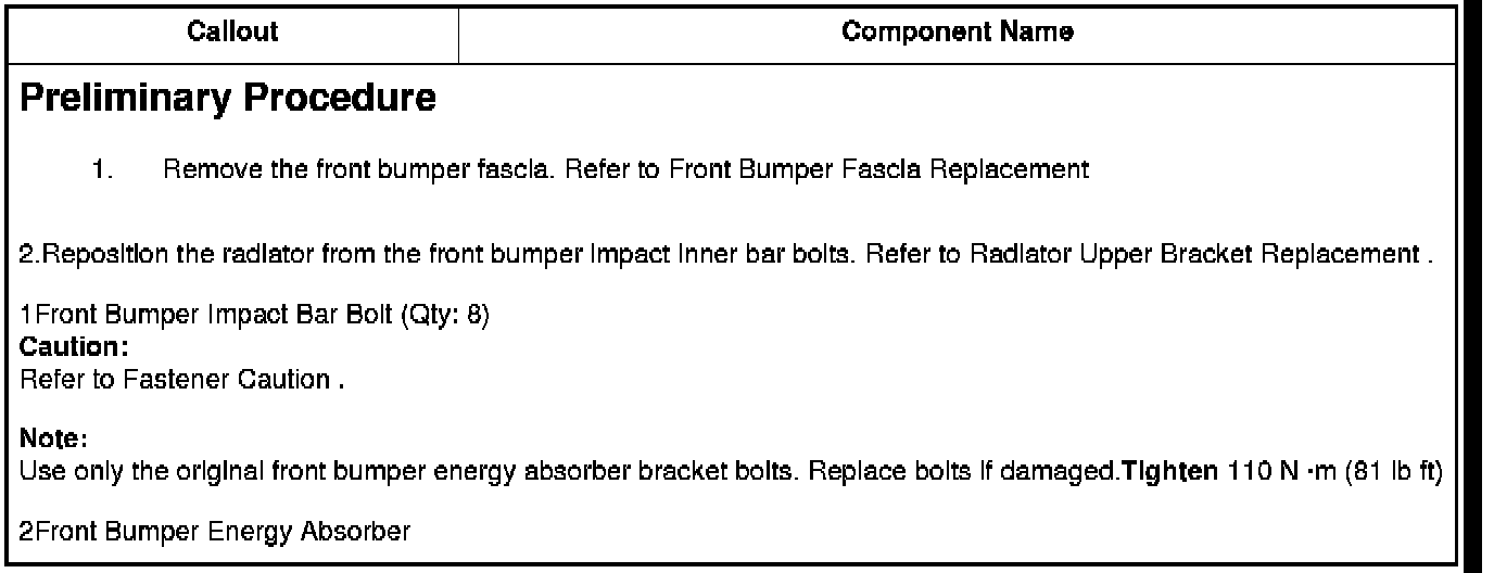 Note:Use only the original front bumper energy absorber bracket bolts. Replace bolts if damaged.Tighten 110 N �m (81 lb ft)