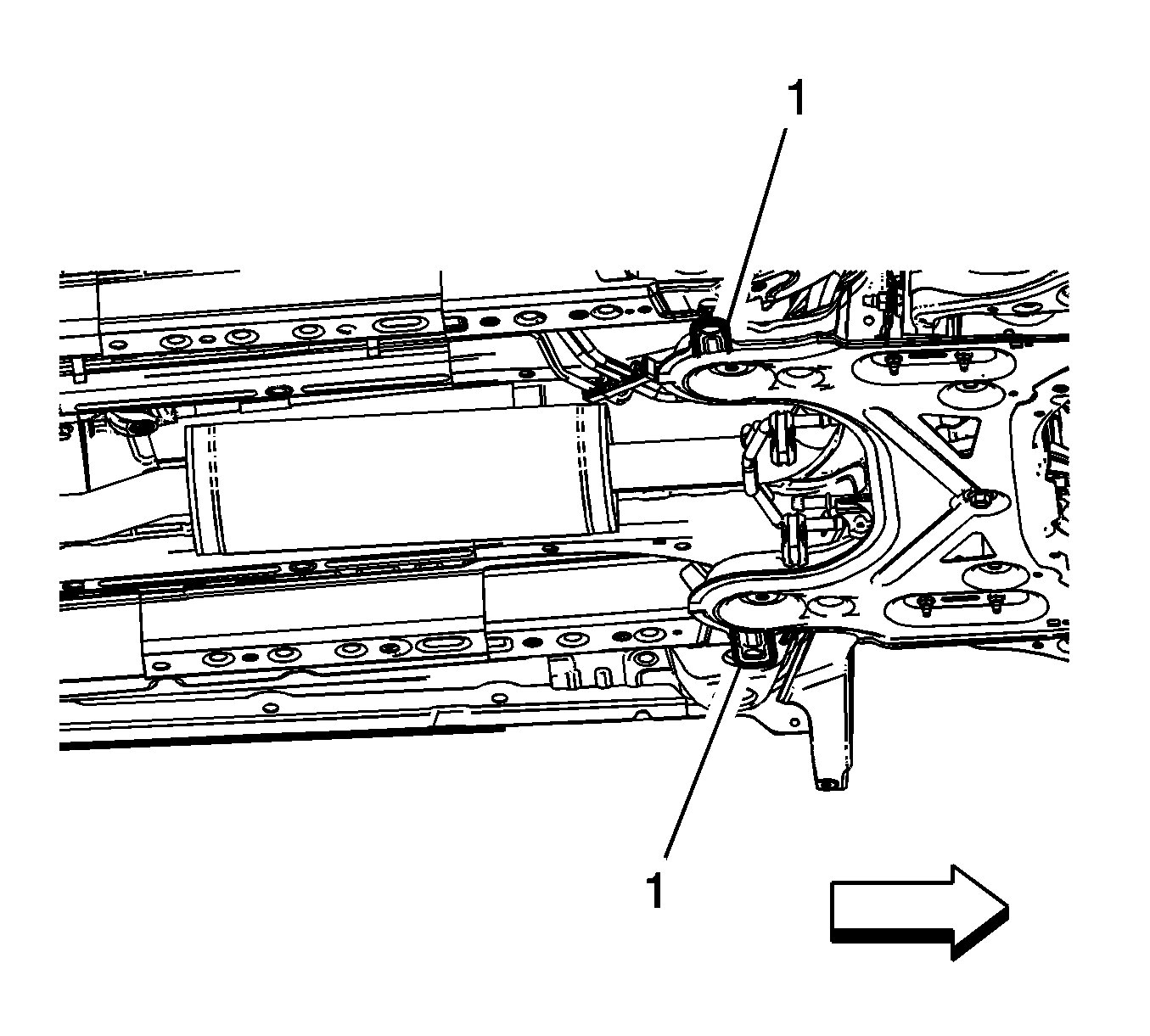 10.Install the rear transmission mount bracket to rear mount through fasteners (1). Refer to Transmission Rear Mount Replacement .