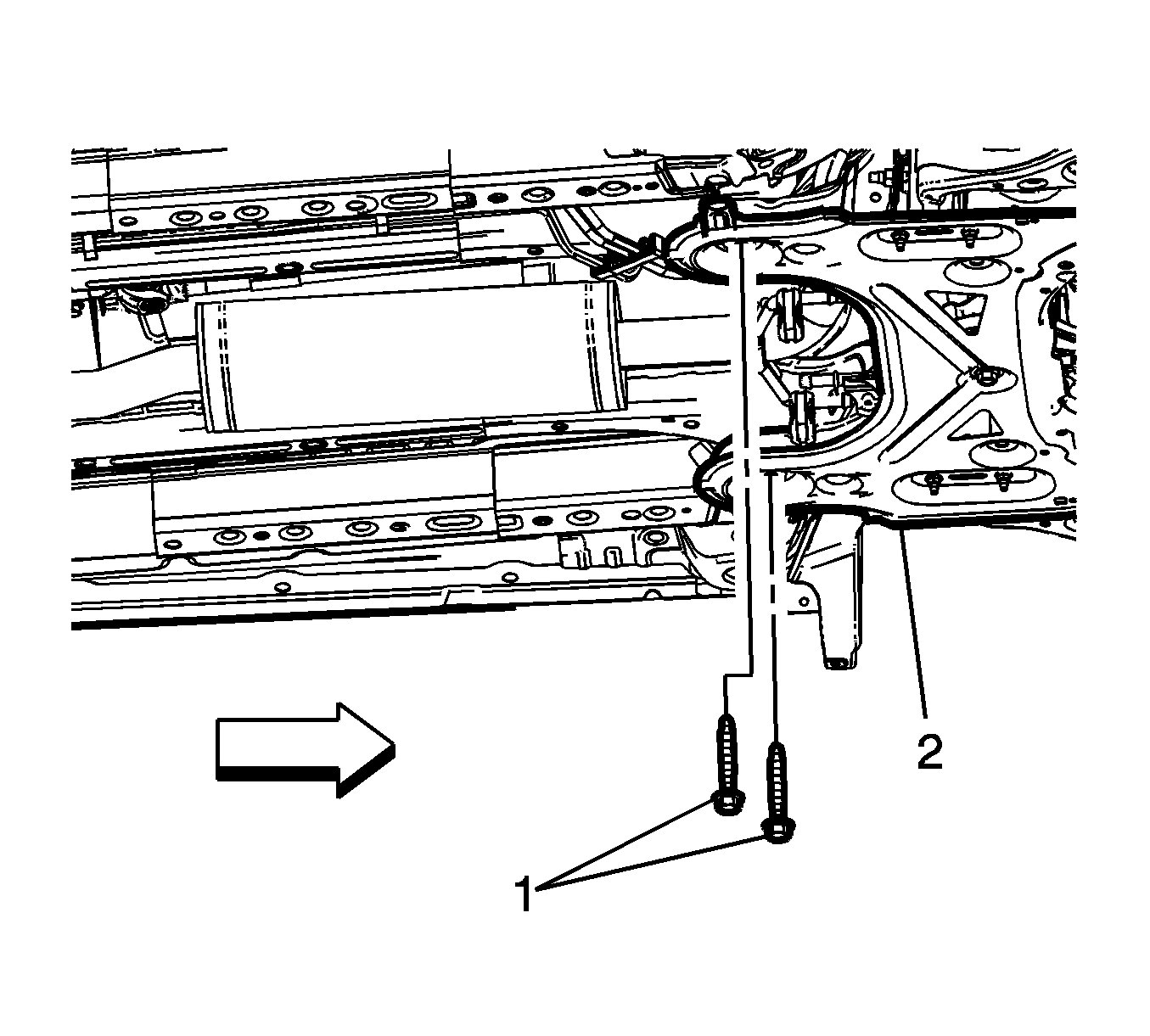 4.Install the frame (2) rear fasteners (1) and tighten: