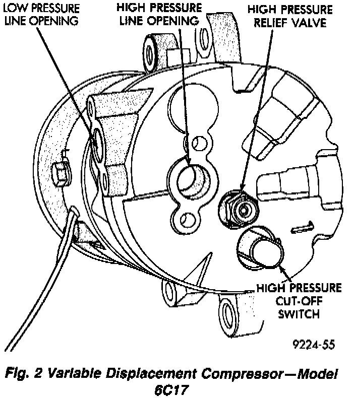 The High Pressure Cut Out (HPCO) switch is located on the rear cover of the Variable Displacement Compressor. The function of the switch is to disengage the compressor clutch by monitoring the compressor discharge (high) pressure. The HPCO Switch is in the same circuit as the Differential Pressure Cut Out (DPCO) switch and Ambient Switch.