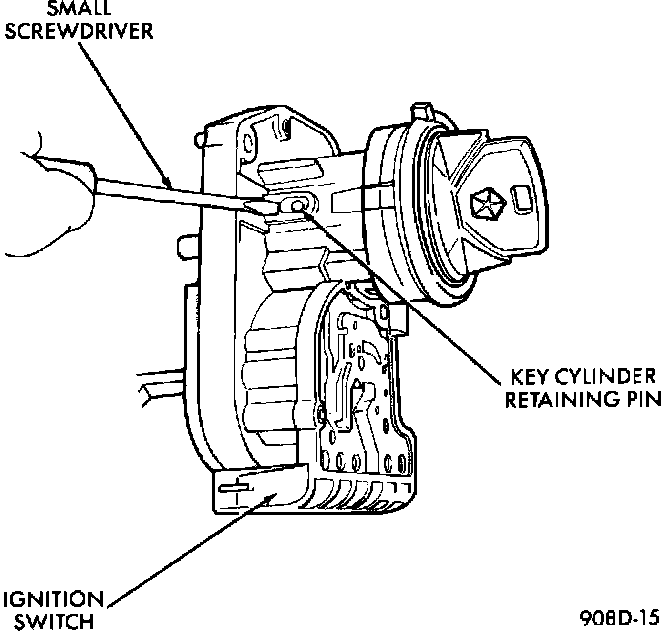 1. Insert key in the ignition switch. Turn the key to the LOCK position. Using a small screwdriver, depress the key cylinder retaining pin until it is flush with the key cylinder surface.