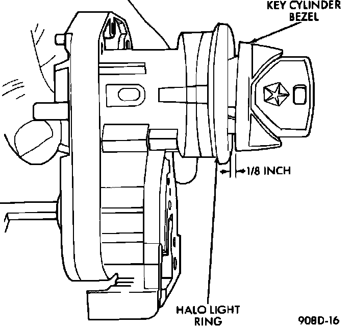 2. Rotate the key clockwise to the OFF position. The key cylinder will unseat from the ignition switch. When the key cylinder is unseated, it will be approximately 1/8 inch away from the ignition switch halo light ring. Do not attempt to remove the key cylinder at this time.
