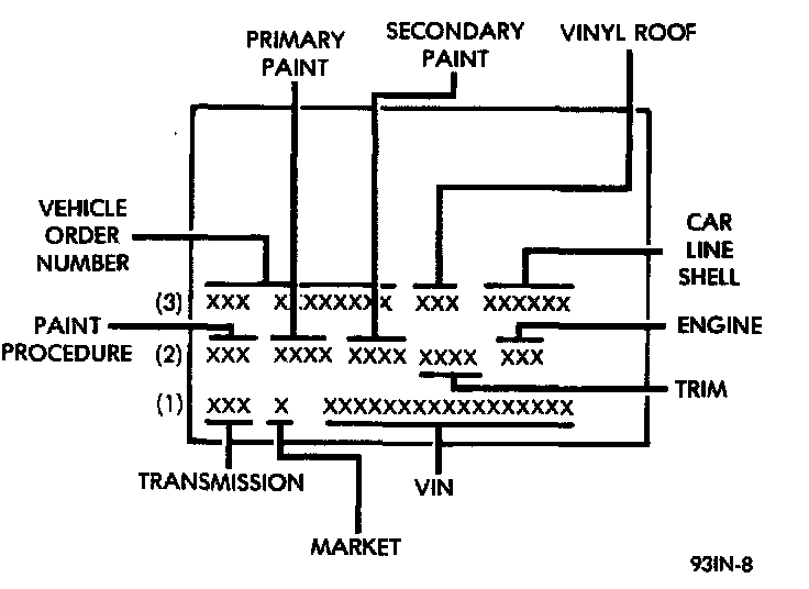 The Body Code Plate is located in the engine compartment on the radiator closure panel crossmember. There are seven lines of information on the body code plate. Lines 4, 5, 6, and 7 are not used to define service information. Information reads from left to right, starting with line 3 in the center of the plate to line 1 at the bottom of the plate.