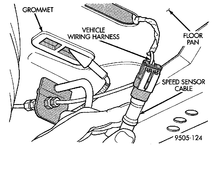 3. Remove grommet from floor pan of vehicle and unplug speed sensor cable connector from vehicle wiring harness.
