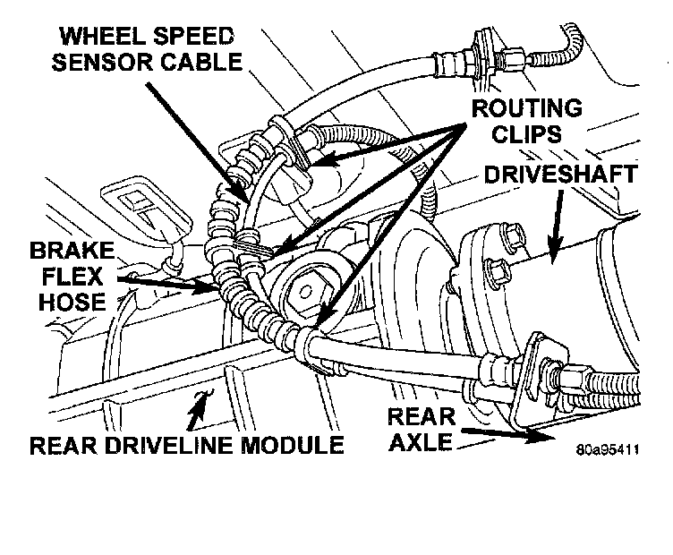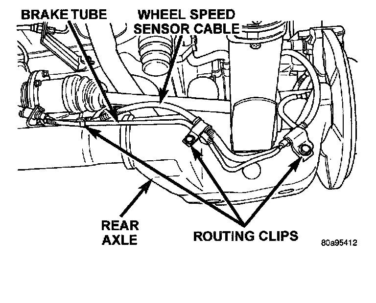 CAUTION: Proper installation of wheel speed sensor cables is critical to continued system operation. Be sure that cables are installed in retainers. Failure to install cables in retainers as shown may result in contact with moving parts and/or over extension of cables, resulting in an open circuit.