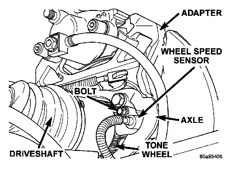 6. Remove the wheel speed sensor attaching bolt. If sensor head does not come loose, do not use pliers on the sensor head to loosen. Tap sensor head from side to side to loosen.