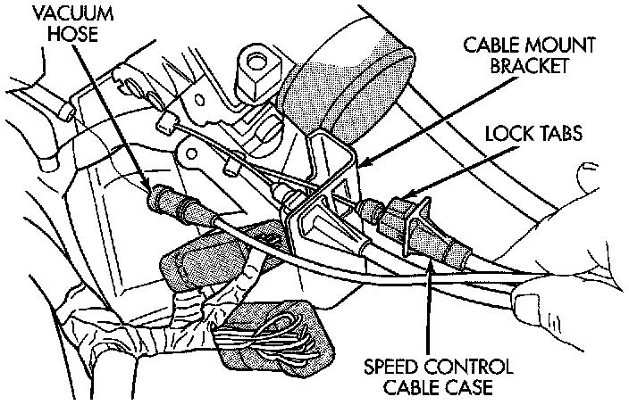 4. Depress lock tabs holding speed control cable casing to cable mount bracket.