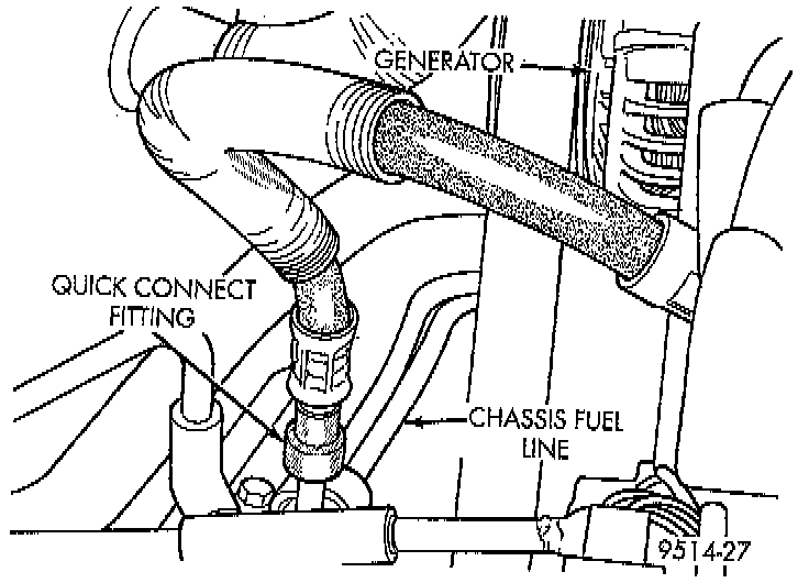 15. Remove the fuel hose quick connect fitting from the fuel line by using an open end wrench pushing in on the plastic ring located on the end of the fittings. Gently pull the fitting from the fuel line.