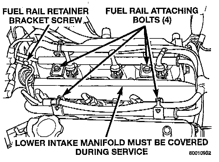 21. Remove fuel tube retainer bracket screw and fuel rail attaching bolts. Spread the retainer bracket to allow fuel tube removal clearance.
