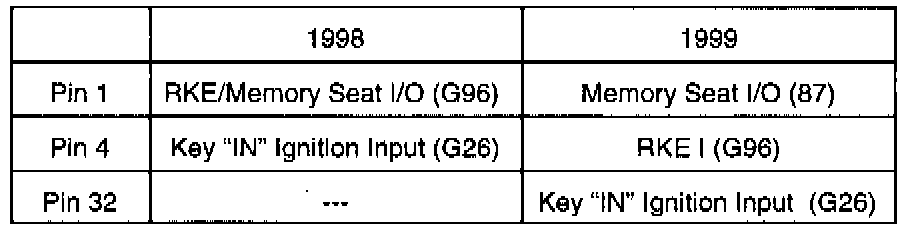 A new key fob and RKE module are used. Pinout for the RKE module is the same as 1998. **RKE and RKE programming is inhibited when the gearshift lever is not in Park.** The system assures no duplicate transmissions. This prevents unauthorized individuals from recording the transmitted signal and coming back later, playing back the "stolen" signal and thus gaining access to the vehicle. The key fob/transmitter programming procedure has changed and is as follows, **if an already programmed key fob/transmitter is available, otherwise a scan tool (DRBIII(R)) must be used to access the programming mode**