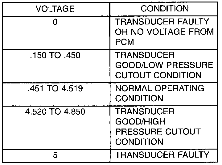 Refer to the A/C Pressure Transducer Voltage table for the appropriate condition(s):