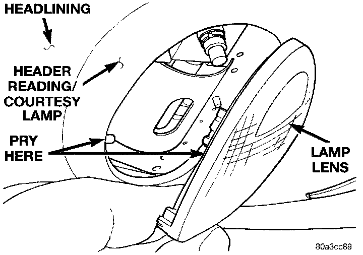 REMOVAL1. Insert a small, flat bladed pry tool at forward position between reading/courtesy lamp lens and lamp housing.