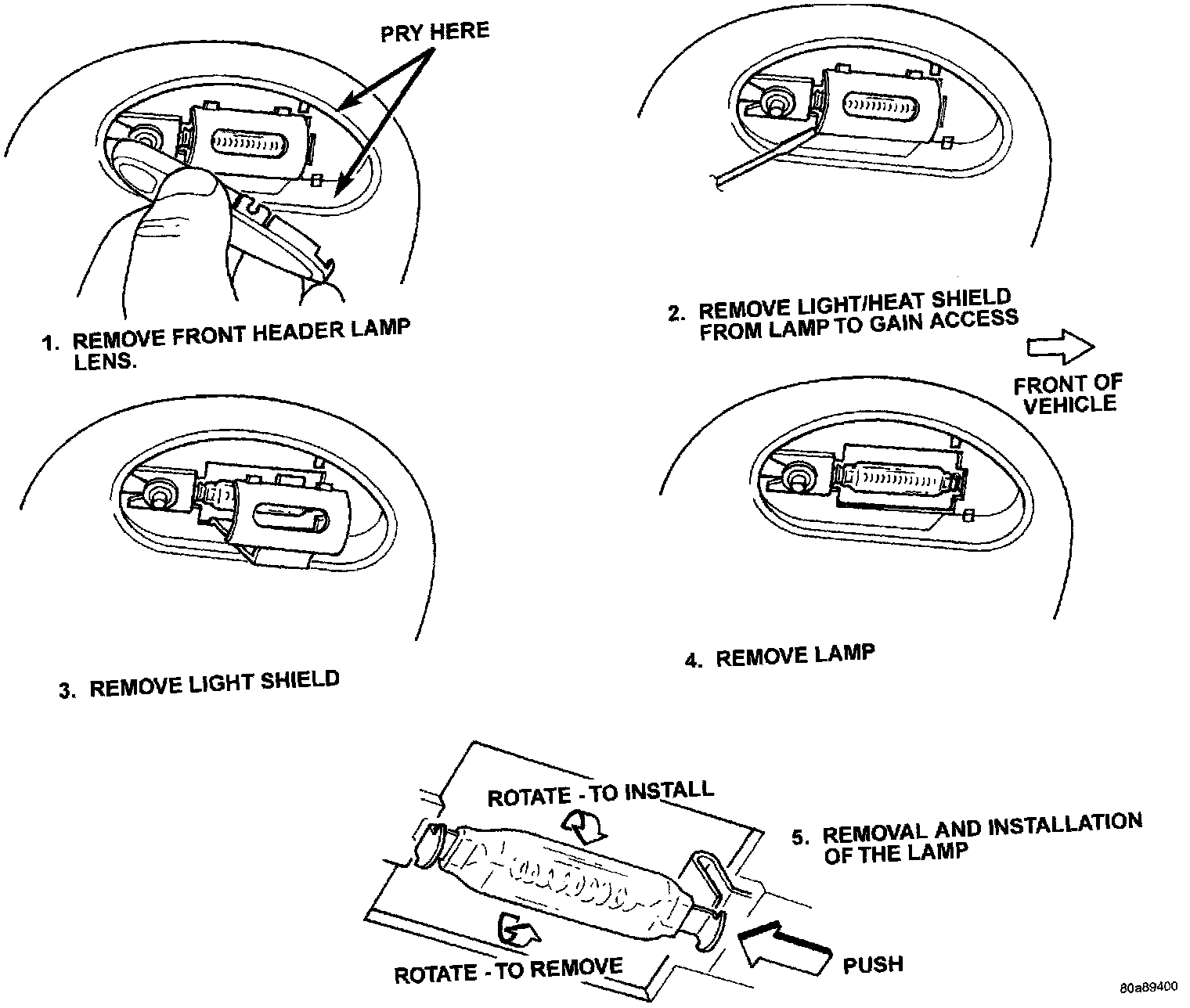 For installation, reverse the above procedures. When installing the lamp lens, first guide the switch contact tab on the lens between the lamp switch plunger and the lamp bezel. Then snap lens onto the two lens pivots on the bezel.