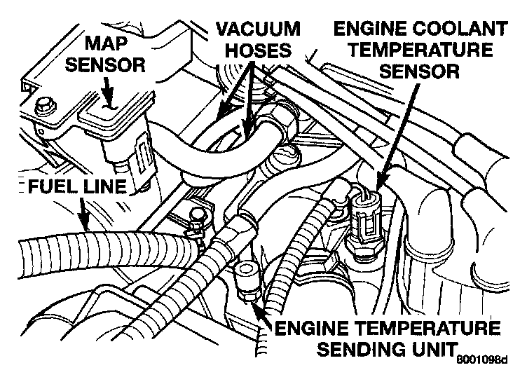 The coolant sensor threads into the top of the thermostat housing. New sensors have sealant applied to the threads.