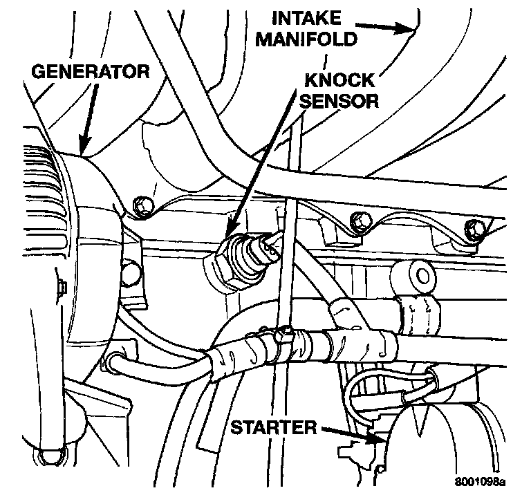 The knock sensor threads into the side of the cylinder block in front of the starter. When the knock sensor detects a knock in one of the cylinders, it sends an input signal to the PCM. In response, the PCM retards ignition timing for all cylinders by a scheduled amount.