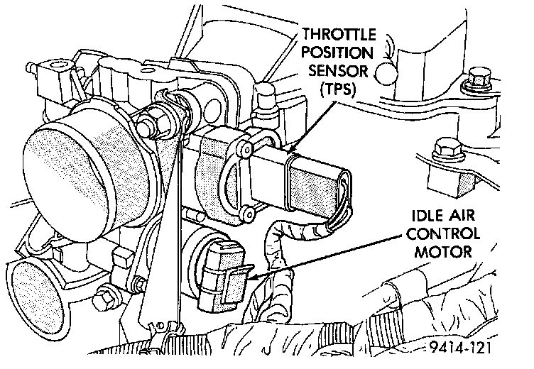 The PCM supplies approximately 5 volts to the TPS. The TPS output voltage (input signal to the PCM) represents the throttle blade position. The TPS output voltage to the PCM varies from approximately 0.5 volt at minimum throttle opening (idle) to 4 volts at wide open throttle. Along with inputs from other sensors, the PCM uses the TPS input to determine current engine operating conditions and adjust fuel injector pulse width and ignition timing.