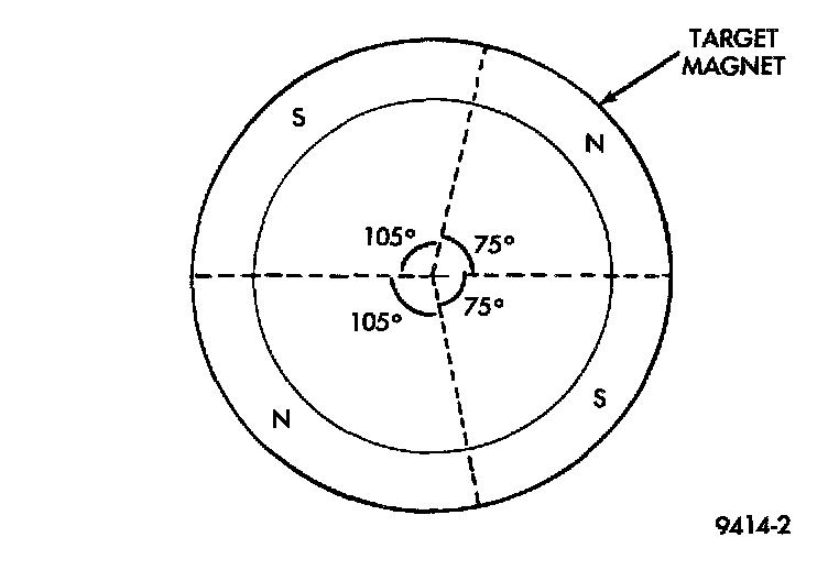The camshaft position sensor attaches to the rear of the cylinder head. A target magnet attaches to the rear of the camshaft and indexes to the correct position. The target magnet has four different poles arranged in an asymmetrical pattern. As the target magnet rotates, the camshaft position sensor senses the change in polarity. The sensor output switch switches from high (5.0 volts) to low (0.30 volts) as the target magnet rotates. When the north pole of the target magnet passes under the sensor, the output switches high. The sensor output switches low when the south pole of the target magnet passes underneath.