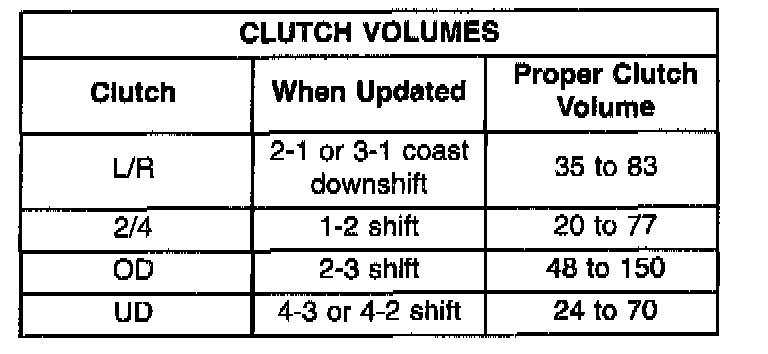 Certain mechanical problems within the input clutch assembly (broken return springs, out of position snap rings, excessive clutch pack clearance, improper assembly, etc.) can cause inadequate or out-of-range element volumes. Also, defective Input/Output Speed Sensors and wiring can cause these conditions. The following chart identifies the appropriate clutch volumes and when they are monitored/ updated: