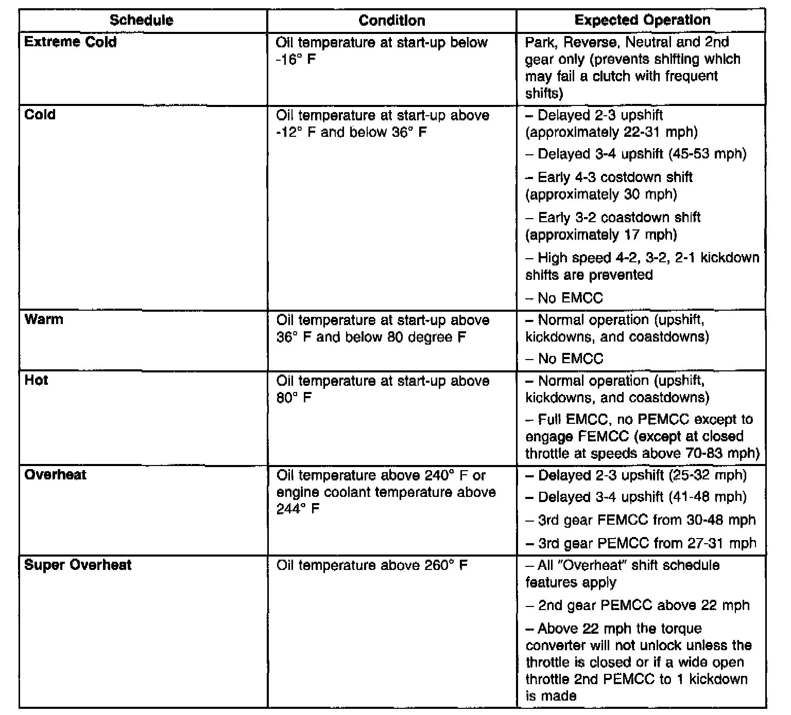 As driving conditions change, the TCM appropriately adjusts the shift schedule. Refer to the provided chart to determine the appropriate operation expected, depending on driving conditions.