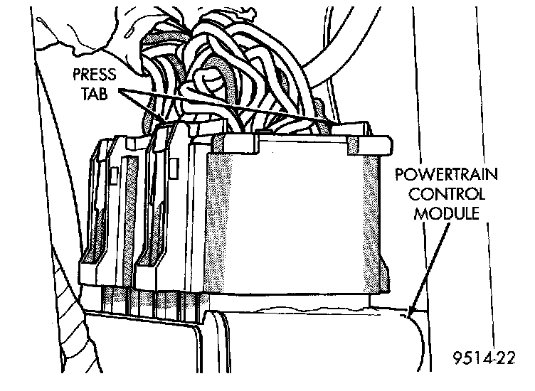 7. Pull PDC rearward to remove from front bracket. Lay PDC aside to allow access to Powertrain Control Module (PCM).