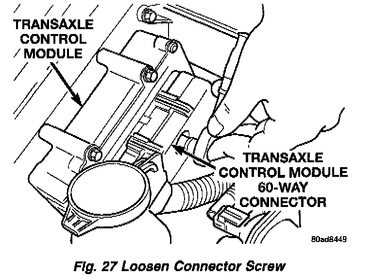 1. Loosen 60 way retaining screw, located in the center of the 60 way connector (Fig.27). Then disconnect the 60 way connector on Transmission Control Module.