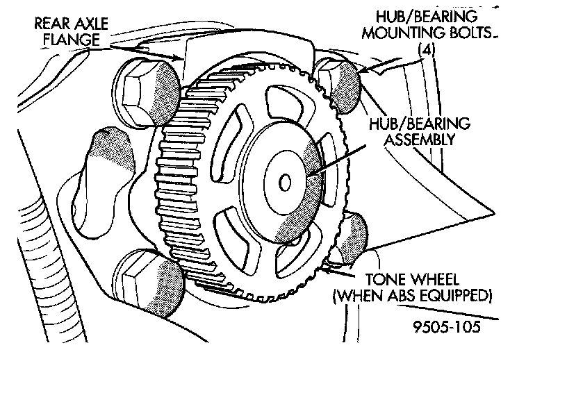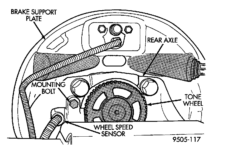 7. Install the rear wheel speed sensor on the rear hub/bearing flange. Install the speed sensor attaching bolt and tighten to a torque of 12 Nm (105 inch lbs.).