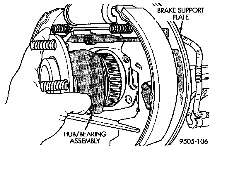 6. Remove the hub/bearing assembly from the rear axle and brake support plate.