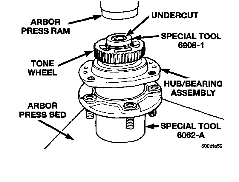 1. Place hub/bearing assembly in an arbor press supported by Receiver, Special Tool, 6062A-3. Position Driver, Special Tool 6908-1 with undercut side facing up on top of the tone wheel.