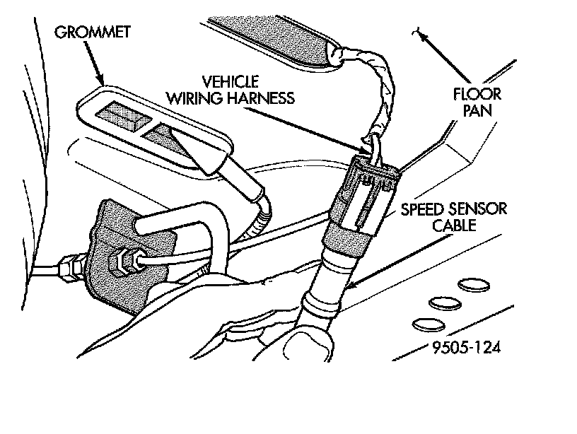 3. Remove grommet from floor pan of vehicle and unplug speed sensor cable connector from vehicle wiring harness.