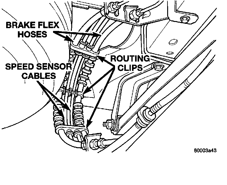 CAUTION: When installing rear wheel speed sensor cable in the routing clips on rear brake flex hose, be sure not to damage the routing clips. Routing clips are molded onto the hose and will require replacement of the brake flex hose if damaged during installation of the wheel speed sensor cable.