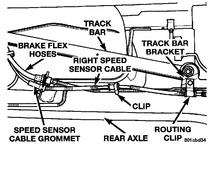 5. If removing the right rear speed sensor cable, remove the speed sensor cable grommet from the axle flange, the brake tube clip and the routing clip from the track bar bracket on the axle.