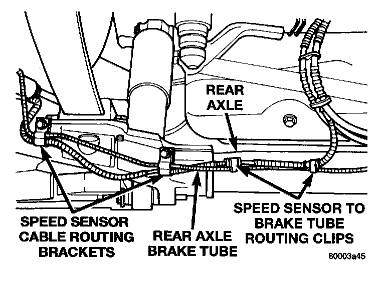 4. Install the 2 routing brackets attaching the speed sensor cable and brake tube to the rear axle. The rear wheel speed sensor cable should be routed under the rear brake tube.