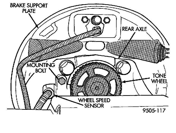3. Check the air gap between the face of the wheel speed sensor and the top surface of the tonewheel. Air gap must be less then the maximum allowable tolerance of 1.2 mm (0.047 inches).