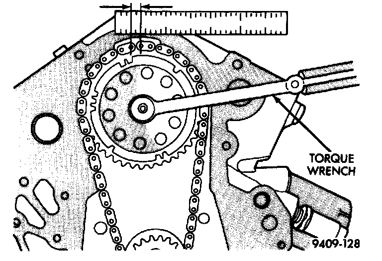 1. Place a scale next to timing chain so that any movement of chain may be measured.2. Place a torque wrench and socket on camshaft sprocket attaching bolt and apply torque in direction of crankshaft rotation to take up slack: 41 Nm (30 ft. lbs.) with cylinder head installed or 20 Nm (15 ft. lbs.) with cylinder heads removed. With a torque applied to the camshaft sprocket bolt, crankshaft should not be permitted to move. It may be necessary to block crankshaft to prevent rotation.