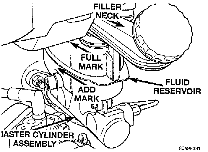 Master cylinder reservoirs are marked with the words FULL and ADD to indicate proper brake fluid fill level of the master cylinder.