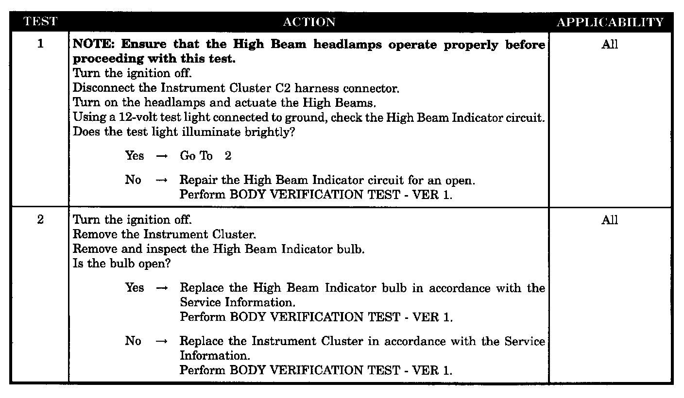 HIGH BEAM INDICATOR INOPERATIVE