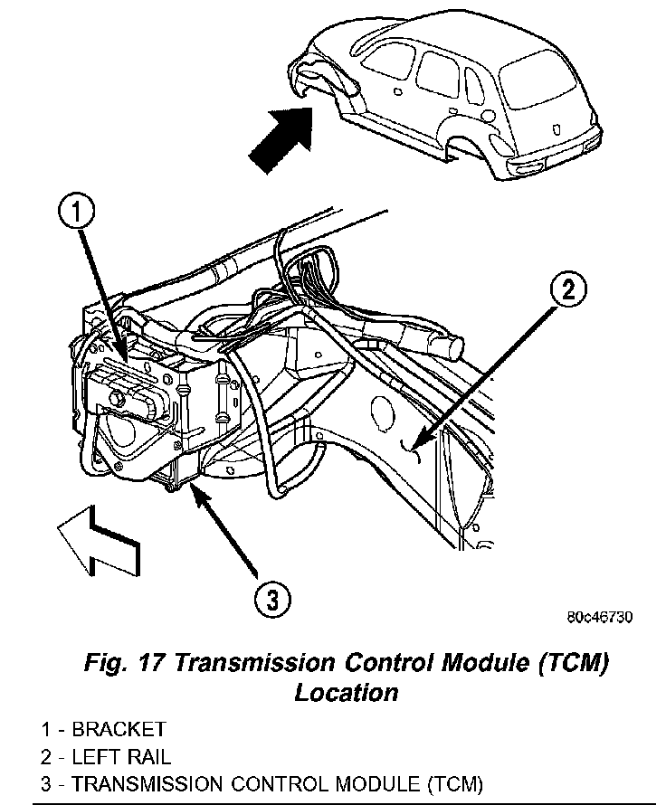 The Transmission Control Module (TCM) is located behind the left fender and is fastened to the left frame rail forward of the suspension (Fig. 17). It mounts on a bracket that is fastened to the rail.