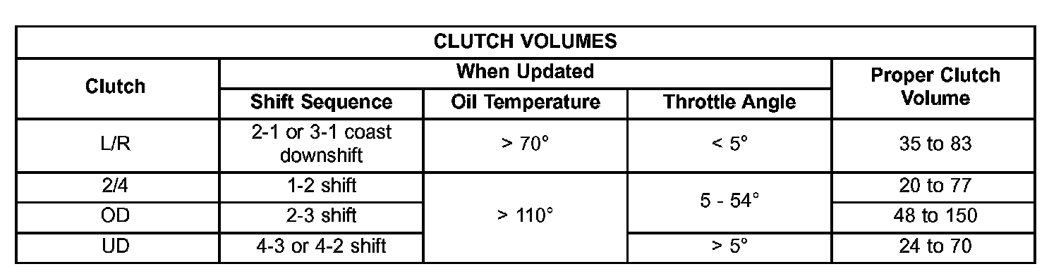 Certain mechanical problems within the clutch assemblies (broken return springs, out of position snap rings, excessive clutch pack clearance, improper assembly etc.) can cause inadequate or out-of-range clutch volumes. Also, defective Input/Output Speed Sensors and wiring can cause these conditions. The above chart identifies the appropriate clutch volumes and when they are monitored/updated: