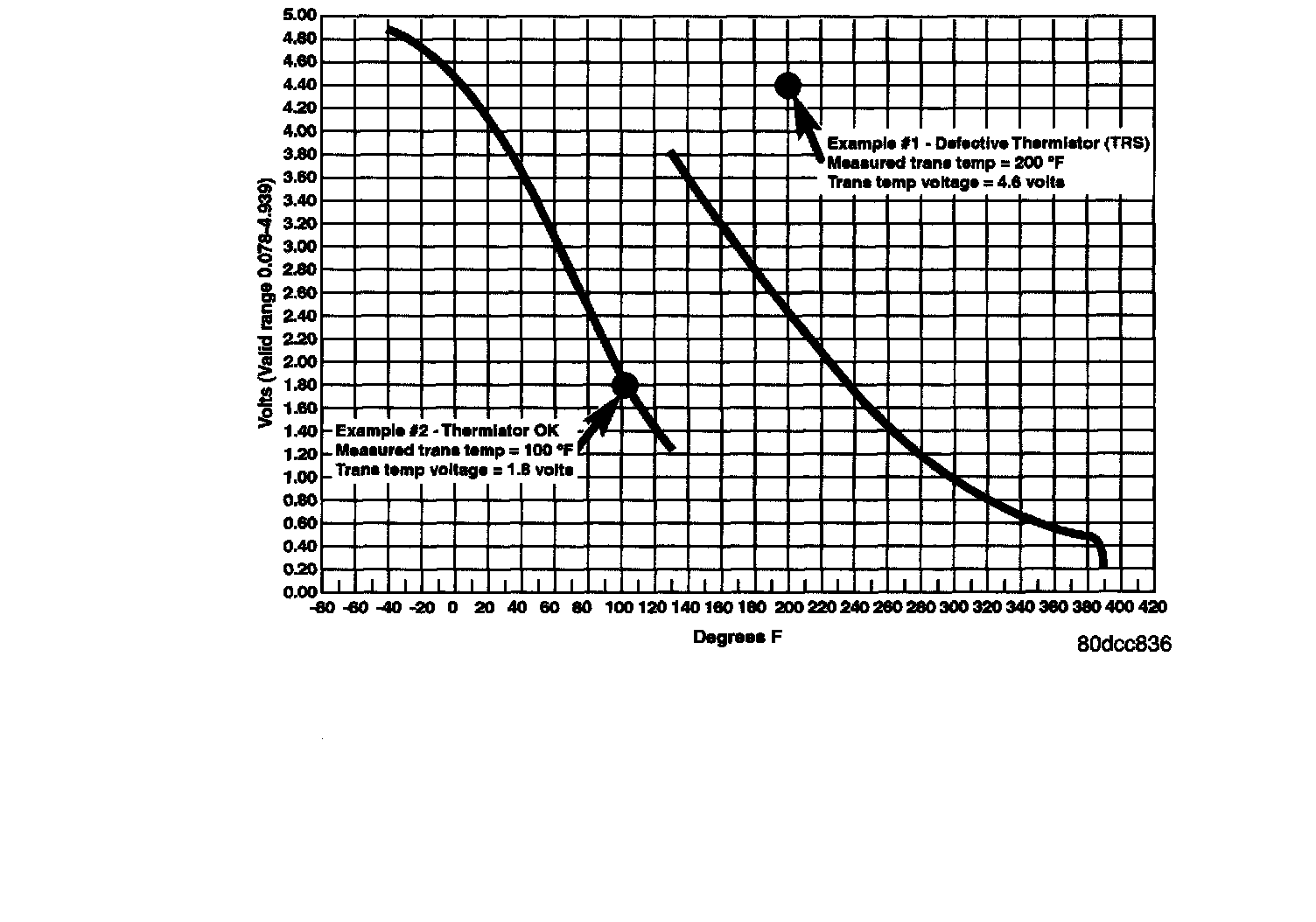 START ENGINE, WITH DRB, MONITOR AND RECORD TRANSMISSION TEMPERATURE VOLTAGE. COMPARE THE MEASURED TEMPERATURE AND VOLTAGE WITH THE GRAPH SHOWN BELOW HERE. THE MEASURED VALUE SHOULD FALL ON ONE OF THE LINES ON THE GRAPH.