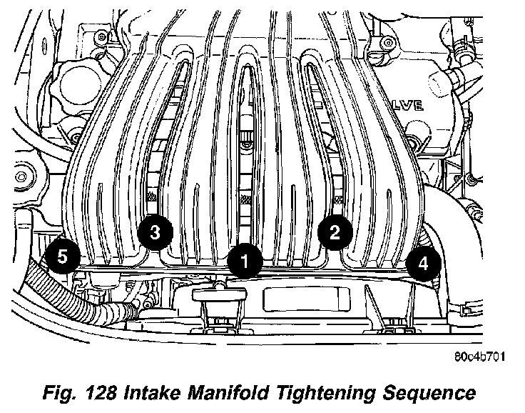 Tighten upper intake manifold fasteners to 12 Nm (105 inch lbs.) in sequence shown in (Fig. 128).