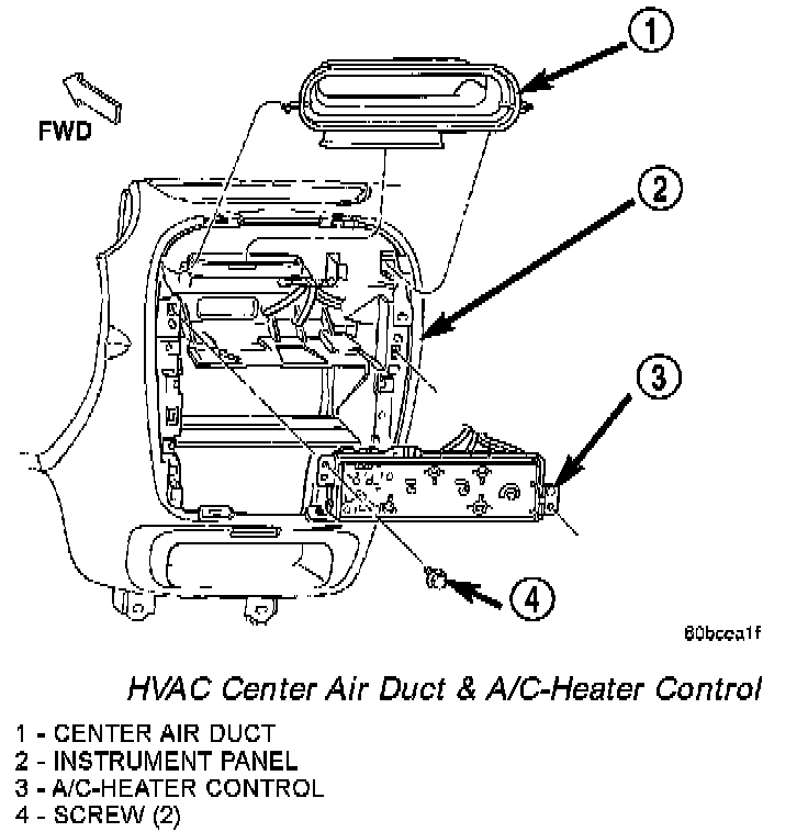3. Remove the screws that secure the A/C-heater control to the instrument panel.