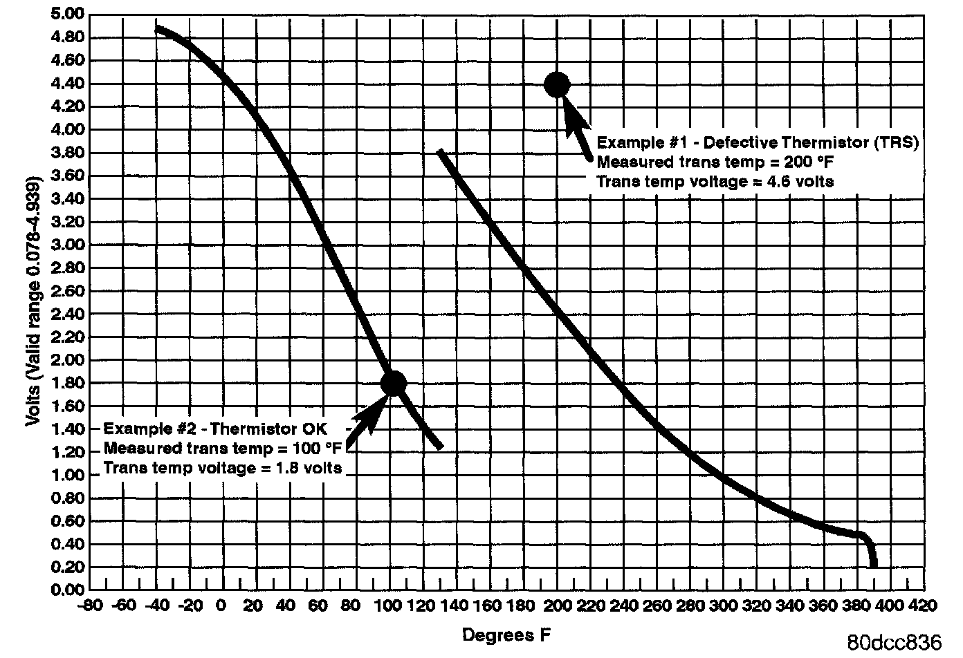 TRANSMISSION TEMPERATURE SENSORTRANSMISSION TEMPERATURE SENSOR (DUAL RANGE)START ENGINE. WITH DRB, MONITOR AND RECORD TRANSMISSION TEMPERATURE VOLTAGE. COMPARE THE MEASURED TEMPERATURE AND VOLTAGE WITH THE GRAPH SHOWN BELOW. THE MEASURED VALUE SHOULD FALL ON ONE OF THE LINES ON THE GRAPH.