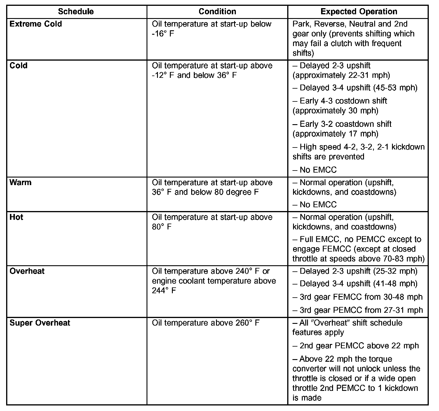As driving conditions change, the TCM appropriately adjusts the shift schedule. Refer to the above chart to determine the appropriate operation expected, depending on driving conditions.
