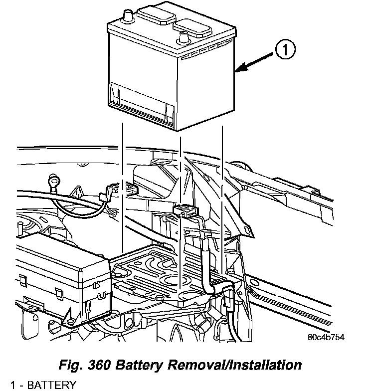 3. Remove the battery hold down clamp and remove the battery (Fig. 360).